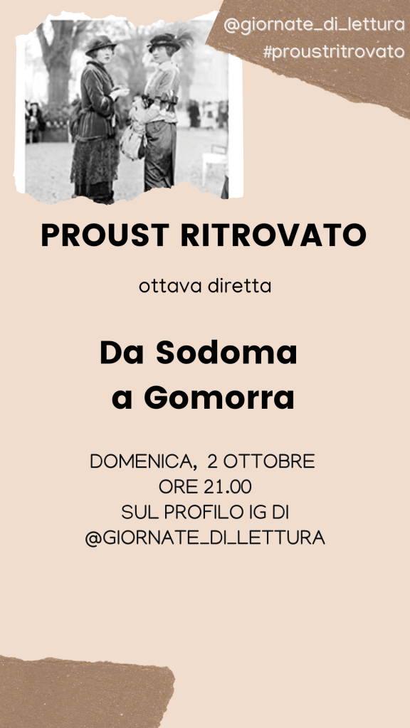 Si terrà la prossima domenica, 2 ottobre, alle 21, l’ottava diretta del nostro gruppo di lettura 🕰 GdL Proust ritrovato. In questa occasione, Gerardo e Vittorio ripercorreranno i passi più importanti di Sodoma e Gomorra, quarto volume de Alla ricerca del tempo perduto. Trovate tutte le informazioni sulla locandina qui accanto.