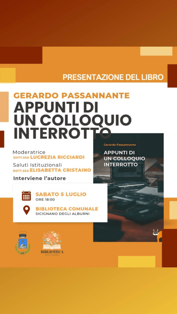 Chi segue Giornate di lettura conosce bene Gerardo Passannante: è uno di noi, fa parte della squadra che anima questo blog con le sue Briciole di filosofia, le sue Pagelle letterarie e più di recente la rubrica dedicata alle opere giovanili di Dostoevskij. Ma forse non tutti sanno che Gerardo è originario di Sicignano degli Alburni, il piccolo centro del Salernitano che sabato 5 luglio alle ore 18:00 lo accoglierà per la presentazione del suo nuovo romanzo Appunti di un colloquio interrotto presso la Biblioteca Comunale.